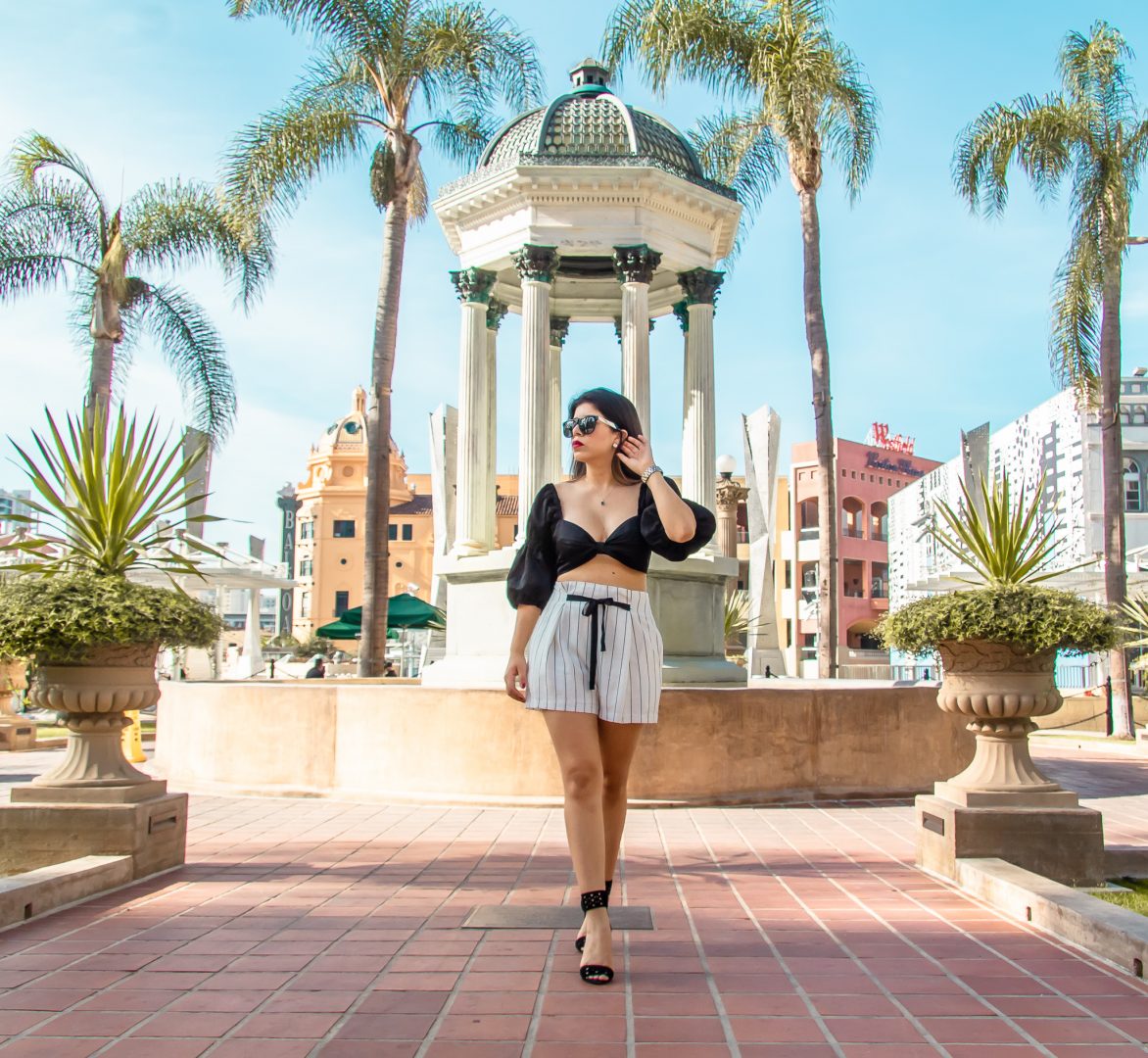 For a summer sophisticated look, I am wearing the crop top with puffy sleeves, LPA from revolve and matched it with L’Academie bilo shorts. Perfect for a summer classy look!