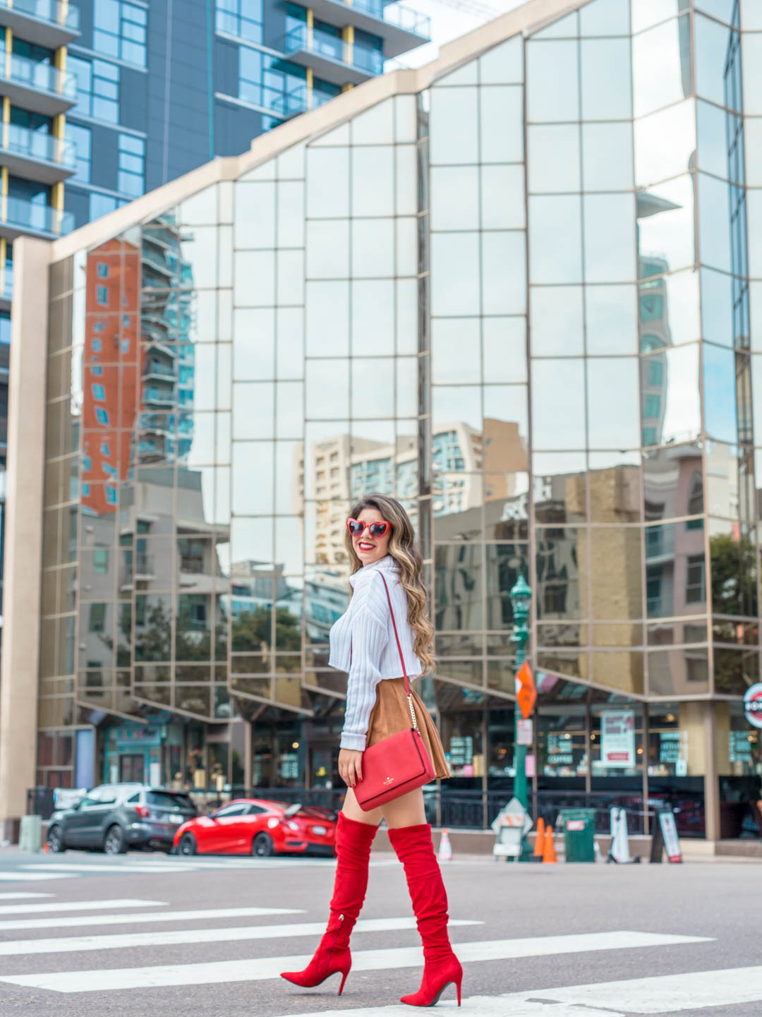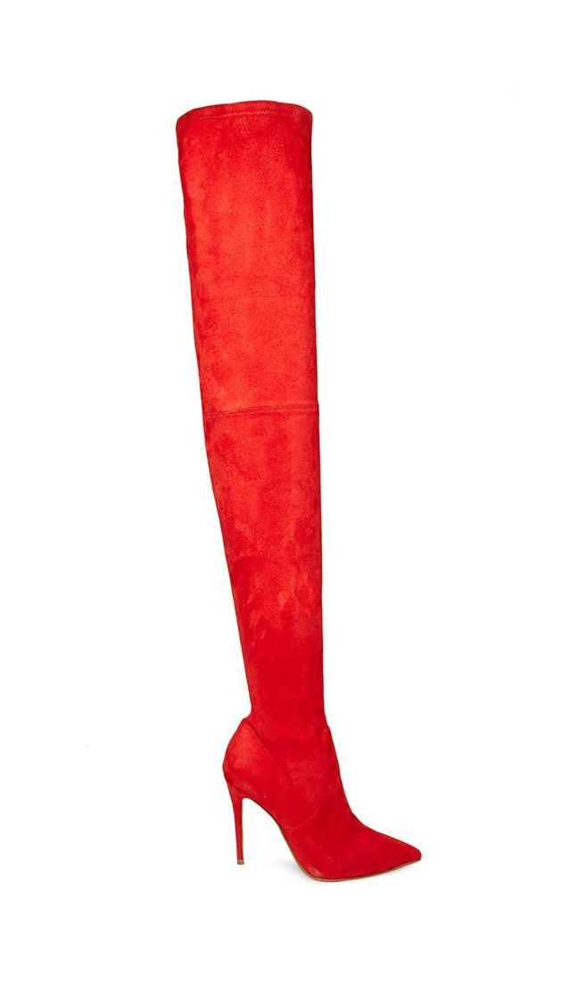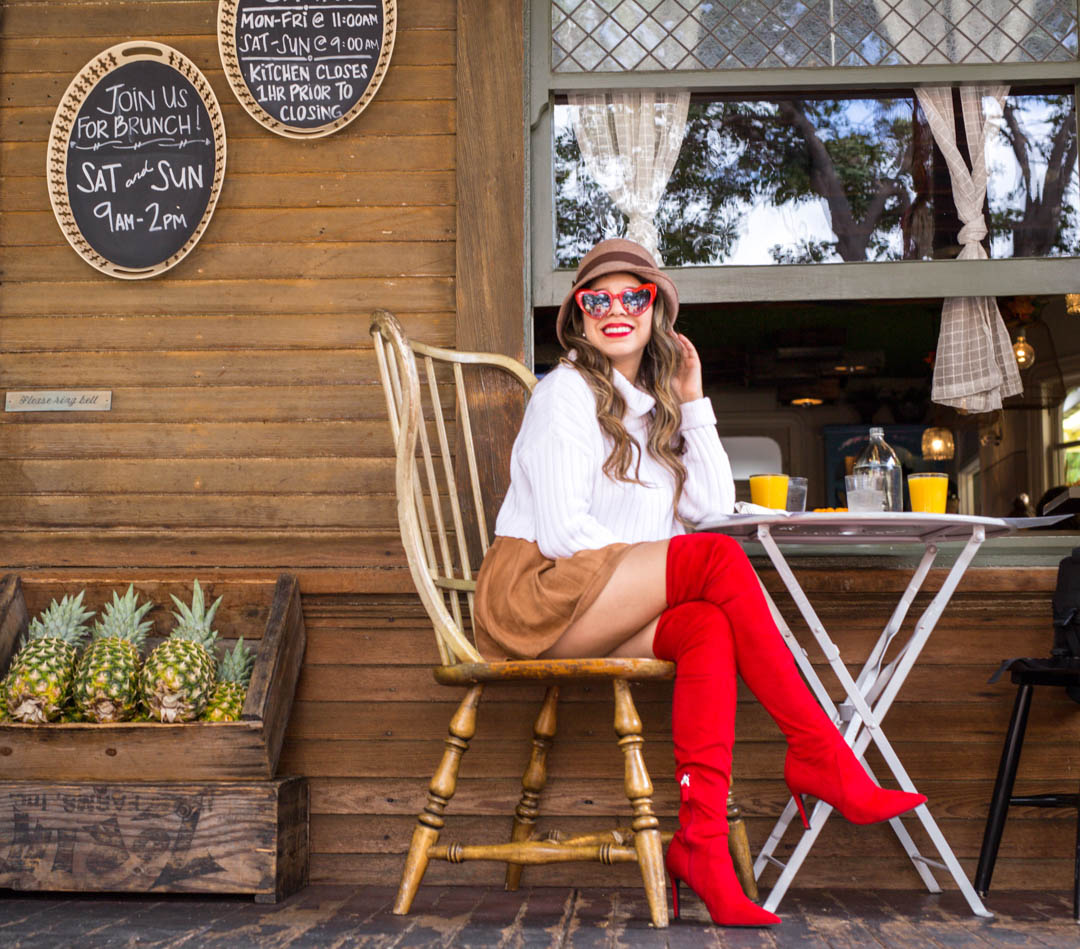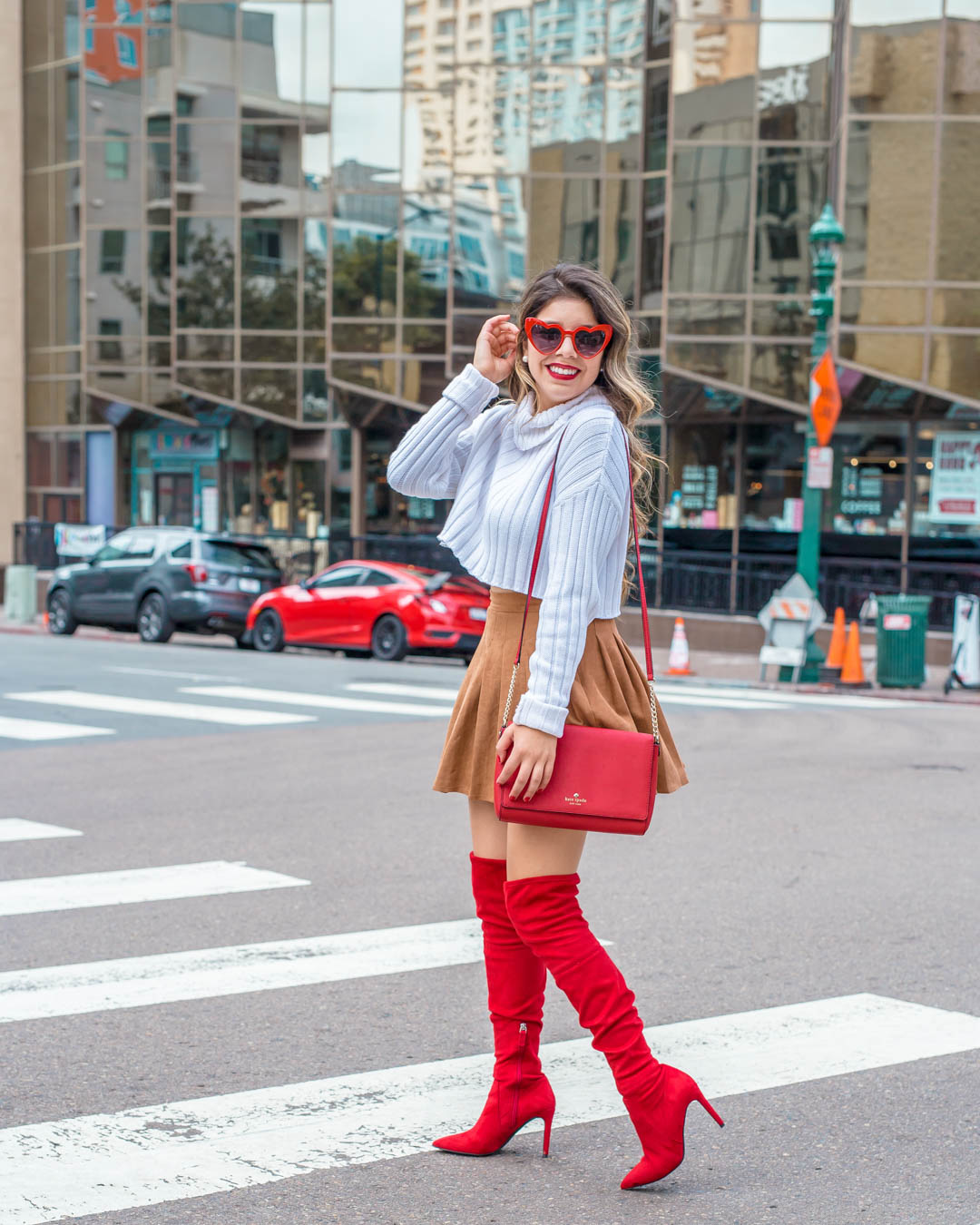 Make it a cute outfit day with these beautiful red over the knee boots and camel pleated skirt and crop white sweater!