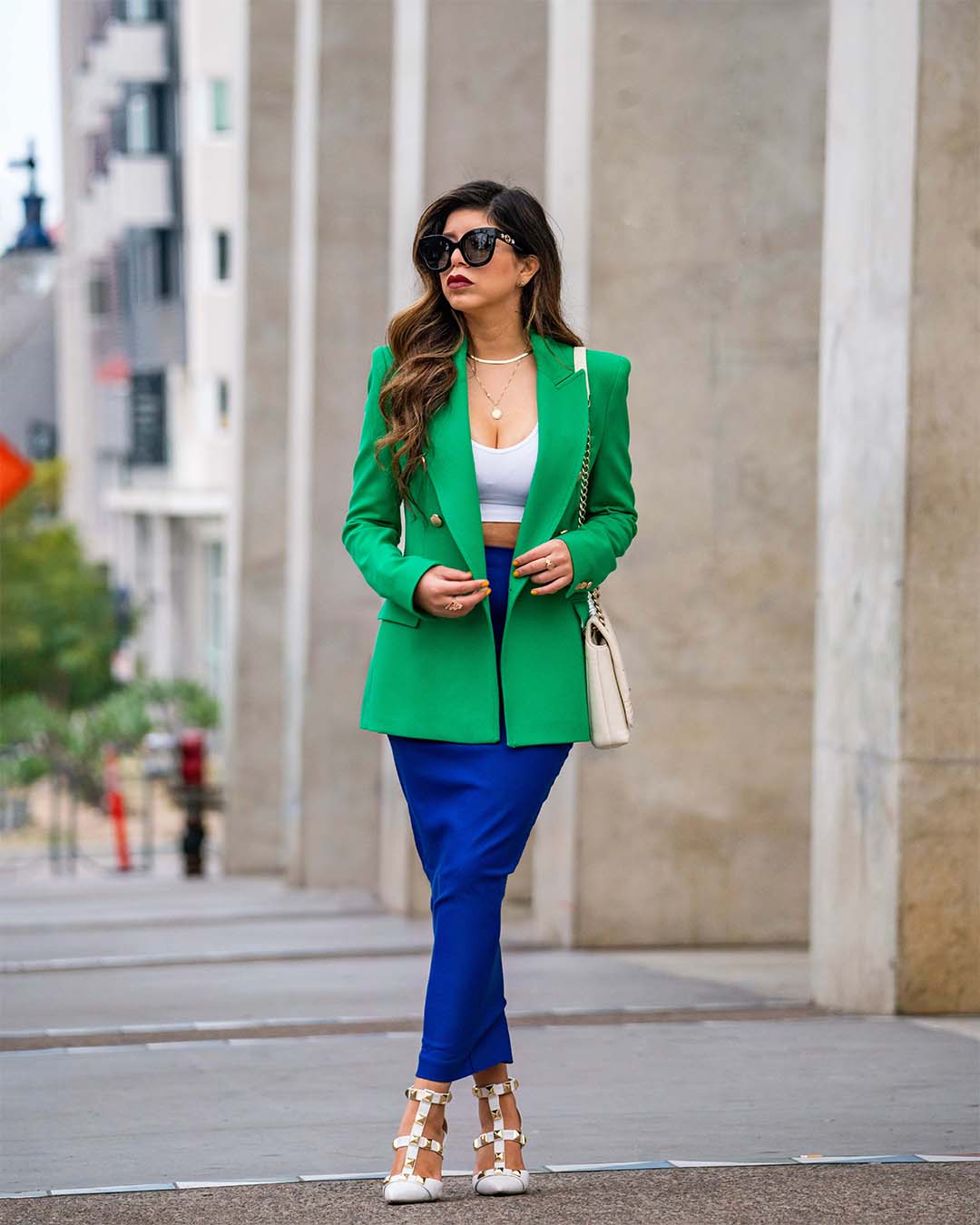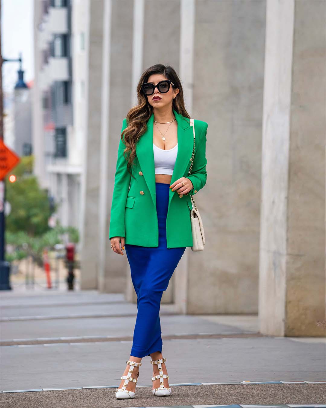 ASOS - Vesper tube midi skirt in cobalt - part of a set ZARA - TAILORED DOUBLE BREASTED BLAZER - Green Macys - Syndia Studded Dress Sandals -White Smooth Gucci: Round-frame acetate sunglasses with star