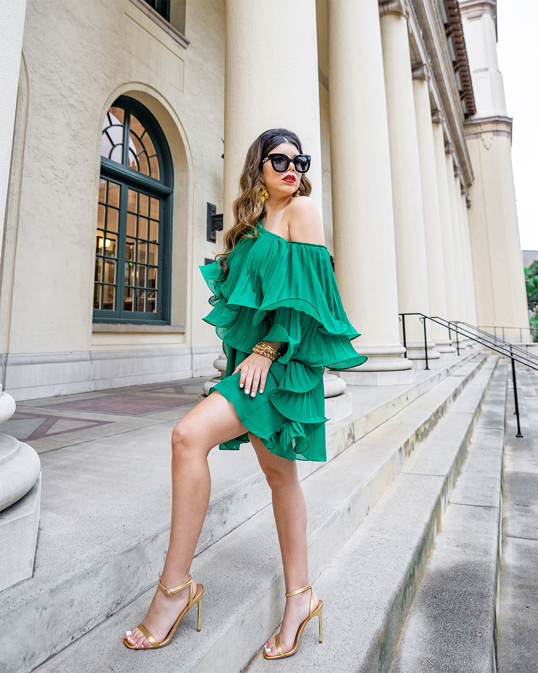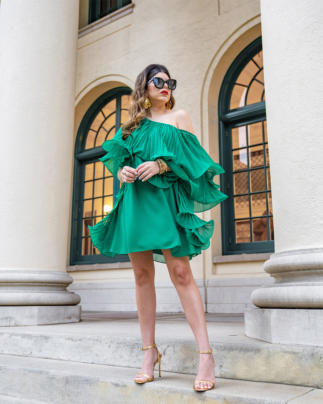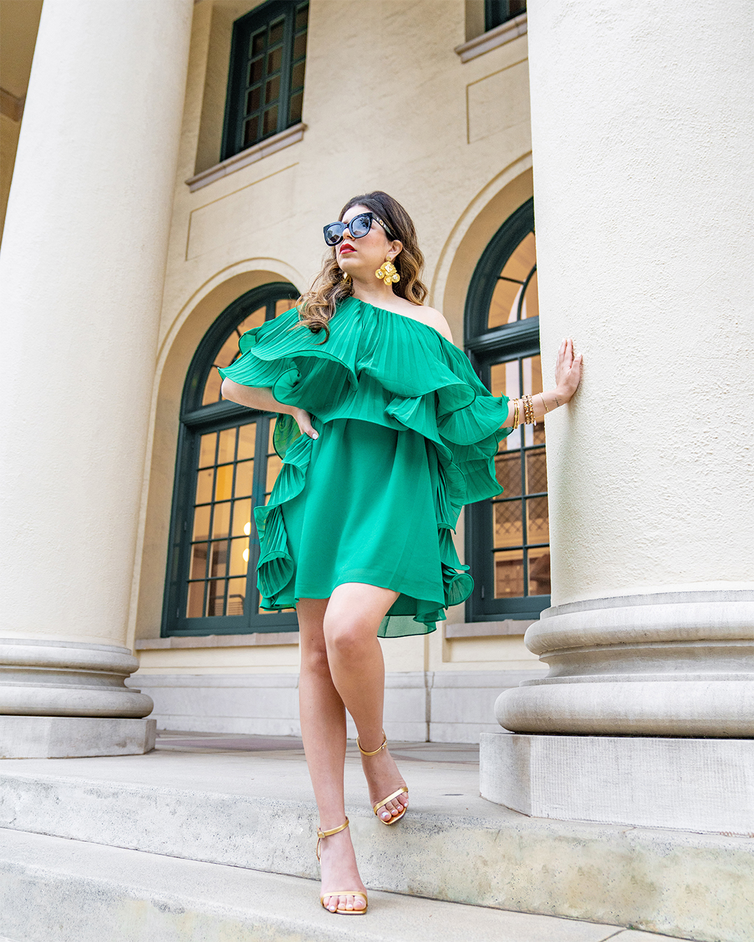 Sacs Fifth Avenue - Badgley Mischka - One Shoulder Ruffle Dress - Palm Green ASOS DESIGN Nova barely there heeled sandals in gold Gucci: Round-frame acetate sunglasses with star