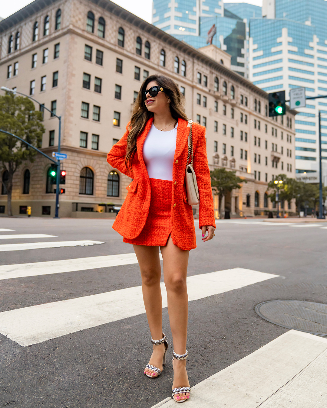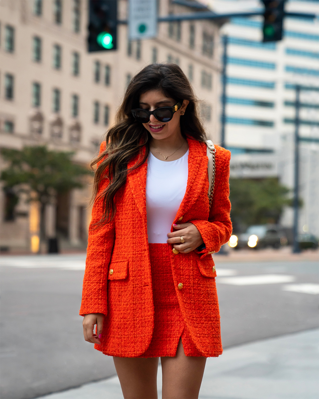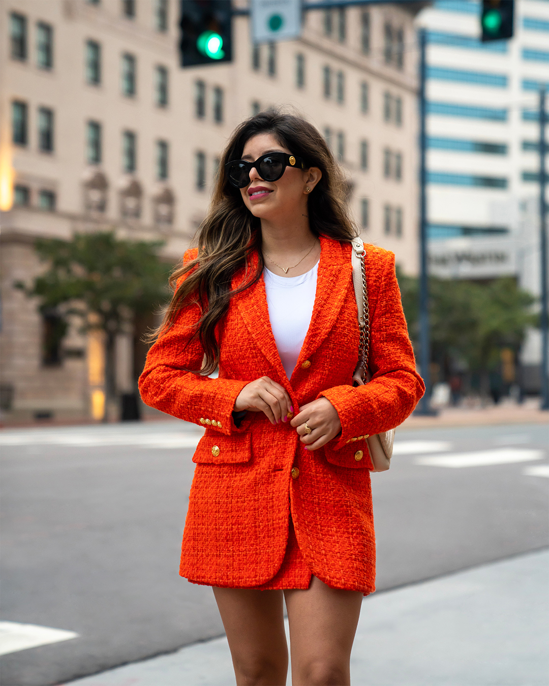 ZARA - PRINTED LINING FITTED JACKET - Orange ZARA - PRINTED LINING MINI SKIRT - Orange ZARA - HALTERNECK BODYSUIT - White Versace: Sunglasses, VE4353 51